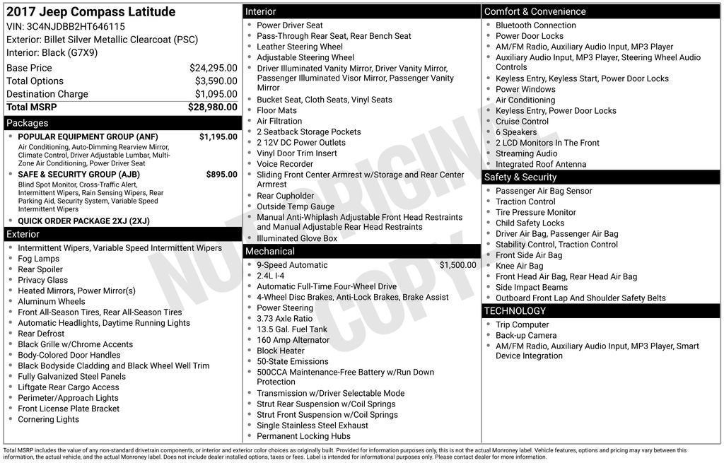 Get behind the wheel of our 2017 Jeep Compass Latitude 4X4 that's refined and powerful in Billet Silver Metallic Clear Coat. Powered by a 2.4 Liter 4 Cylinder that offers 180hp connected to a responsive 9 Speed Automatic transmission that provides plenty of get-up-and-go. This Four Wheel Drive SUV is fun to own, easy to manage while scoring nearly 28mpg on the highway while accented by a signature grille, attractive wheels, and chrome accents.