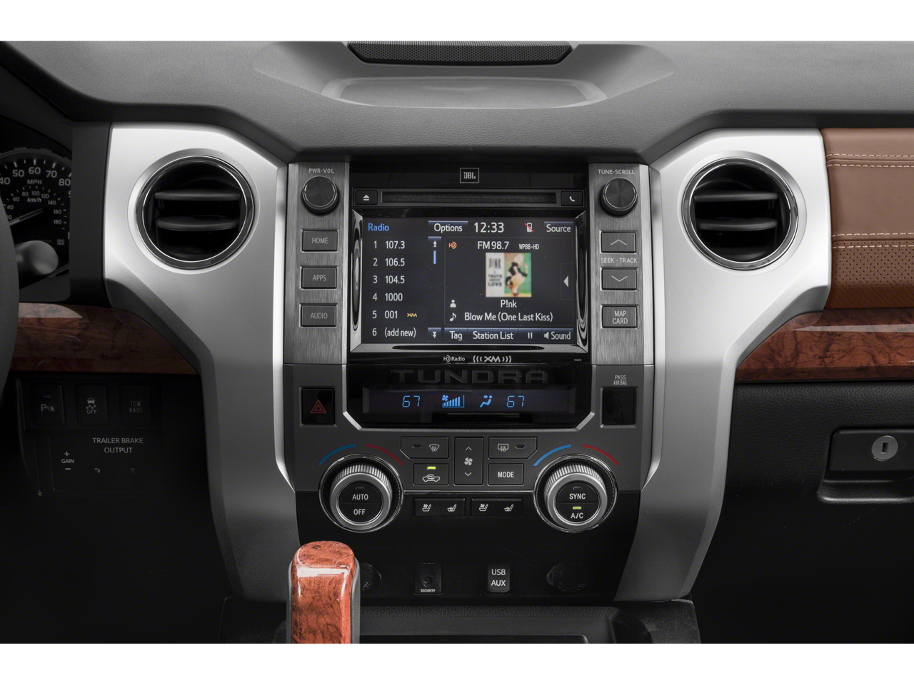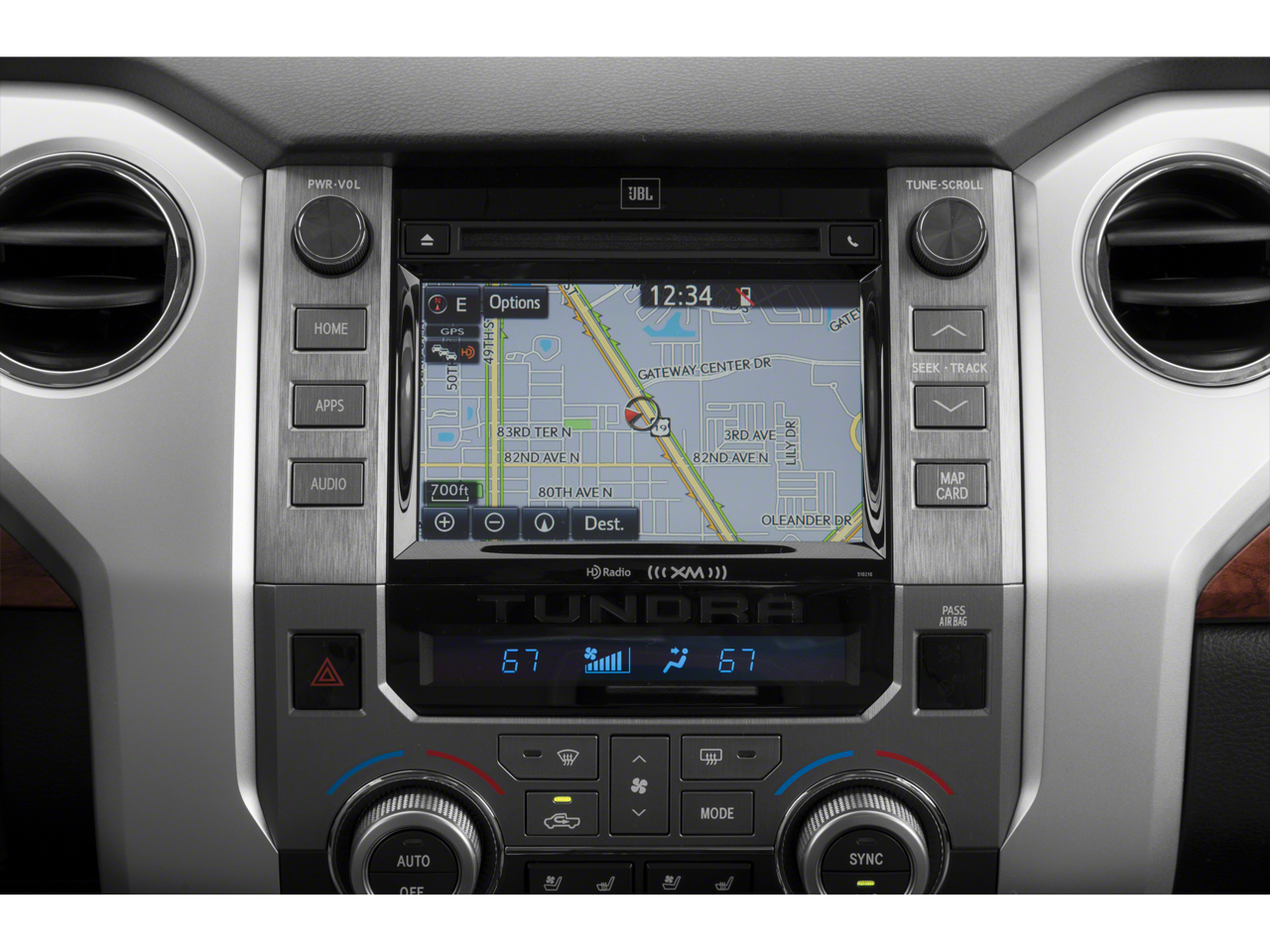 - Radio: Entune Premium JBL Audio AM/FM/HD Radio/CD -inc: integrated navigation system, MP3/WMA playback capability, AM/FM cache radio, 12 JBL speakers including subwoofer and amplifier, 7" high-resolution touch-screen display w/split-screen, auxiliary audio jack, USB media port, HD predictive traffic and Doppler weather overlay, Bluetooth hands-free phone capability w/advanced voice recognition, phone book access and music streaming and Siri Eyes Free, Entune App Suite, Destination Search, iHeartRadio, Yelp and Slacker Radio, SIRIUSXM Satellite Radio, complimentary SiriusXM All Access 90-day trial subscription