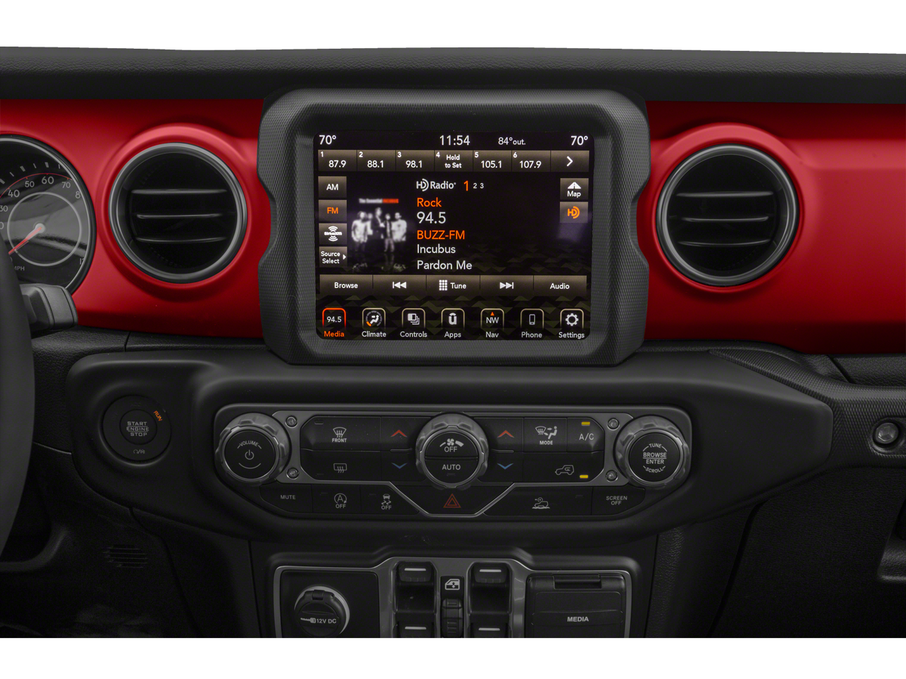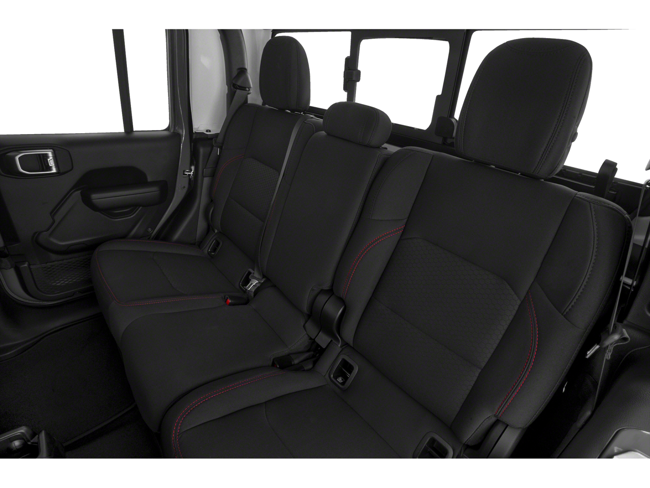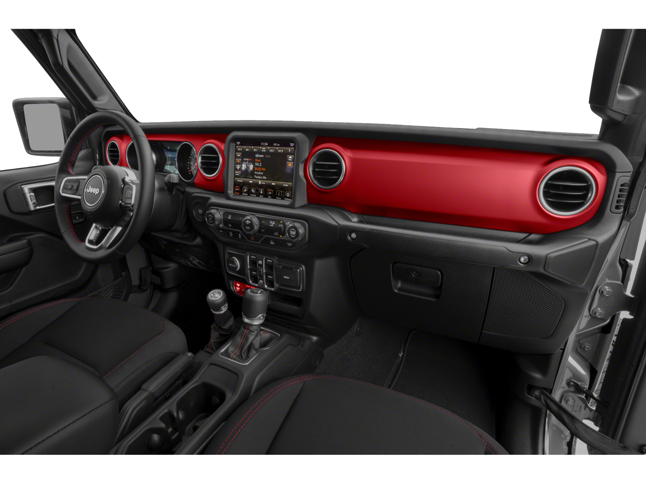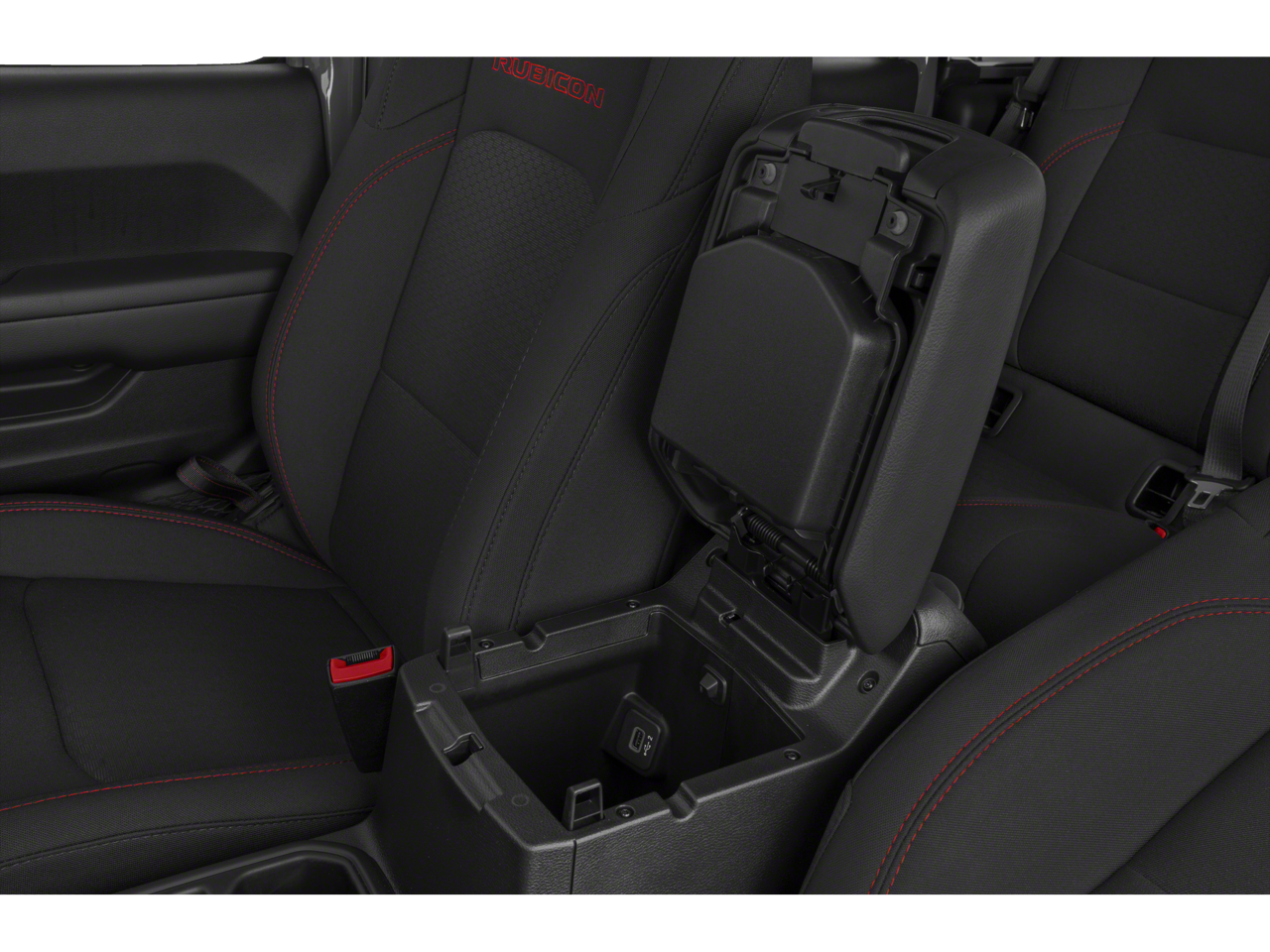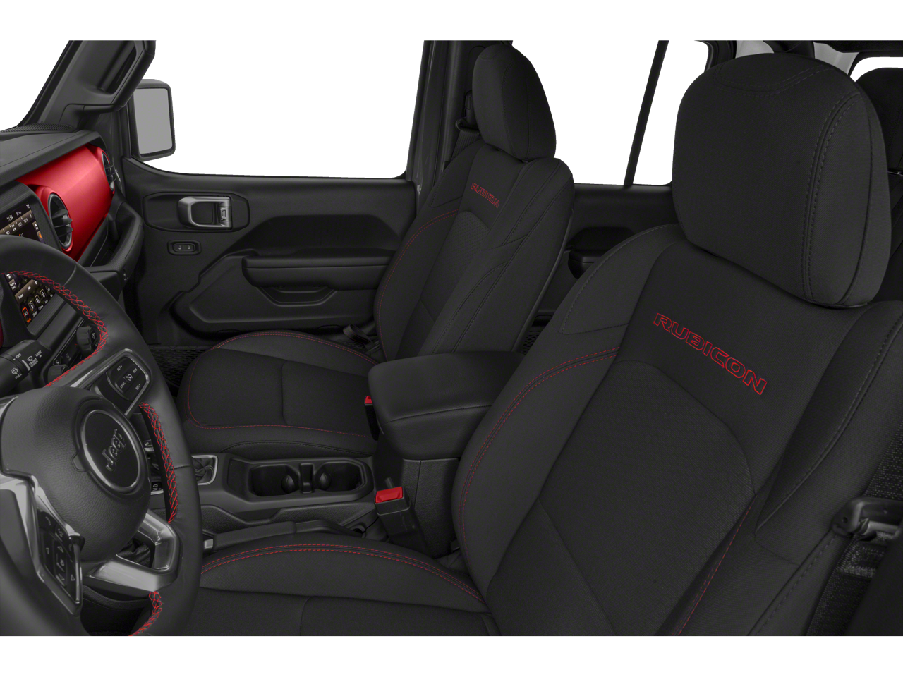 Our Rubicon cabin is ready for adventure with supportive cloth seats, red accent stitching, a leather-wrapped steering wheel, dual-zone automatic climate control, pushbutton ignition, and keyless entry. The versatile interior is well-connected with a 7-inch touchscreen, Apple CarPlay, Android Auto, voice control, Bluetooth®, and an eight-speaker sound system.