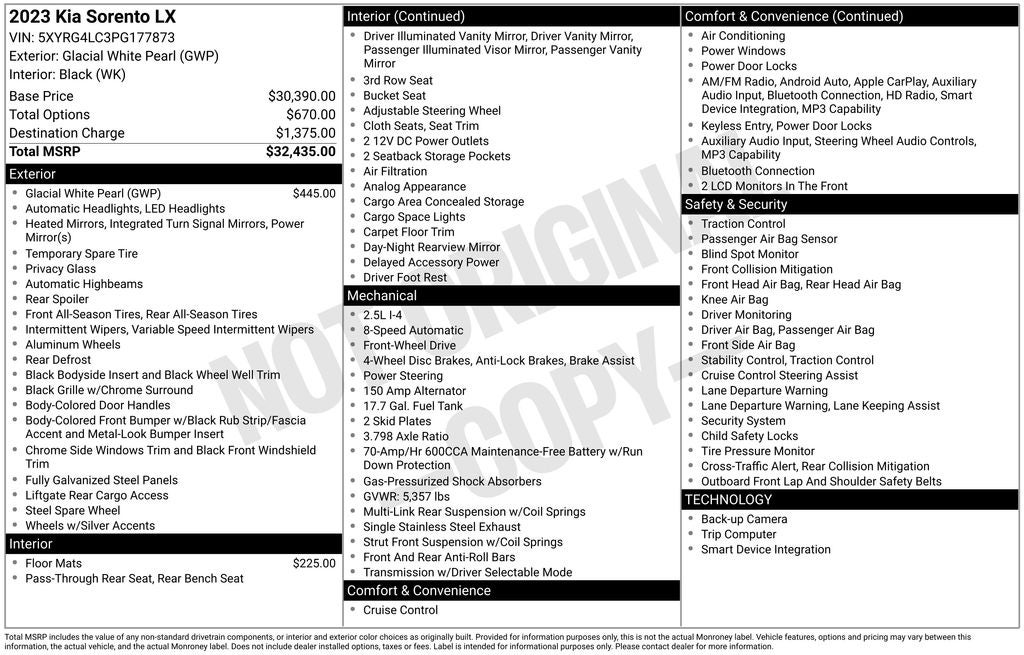 ***PASSED 120 POINT INSPECTION***, ***3RD ROW SEAT***, ***APPLE CAR PLAY / ANDROID AUTO***, ***CRUISE CONTROL***, ***POWER WINDOWS***, ***POWER LOCKS***, Sorento LX, 4D Sport Utility, 2.5L I4 DGI DOHC 16V LEV3-ULEV70 191hp, 8-Speed Automatic, FWD, Glacial White Pearl, Black Cloth.